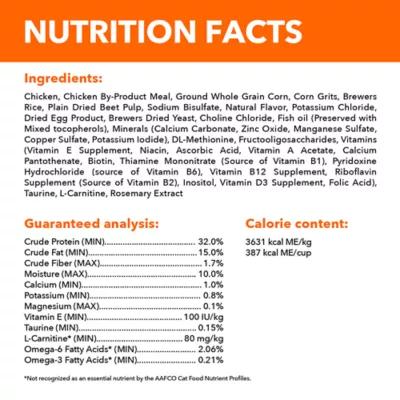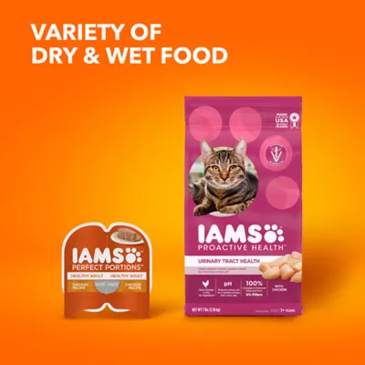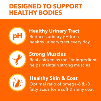 IAMS knows that each cat is different. That's why our range of recipes has been specifically tailored to your cat's needs and life stages. Keep your cats at their best with IAMS PROACTIVE HEALTH Adult Urinary Tract Health Dry Cat Food with Chicken. Perfect for outdoor or indoor cats, this formula helps reduce the pH in cat urine to promote urinary tract health. Chicken is the #1 ingredient in this protein-rich cat kibble formula. Plus, it includes vitamin E to maintain a healthy feline immune system, as well as essential nutrients, like calcium and potassium, for a healthy heart. The kibble has an optimal omega-6 and -3 fatty acid ratio for a soft, shiny coat, and the crunchy texture helps reduce plaque buildup. So, if you're looking for a dry food for urinary tract health, get your paws on this, and keep your feline happy, healthy, and ready to pounce with IAMS.