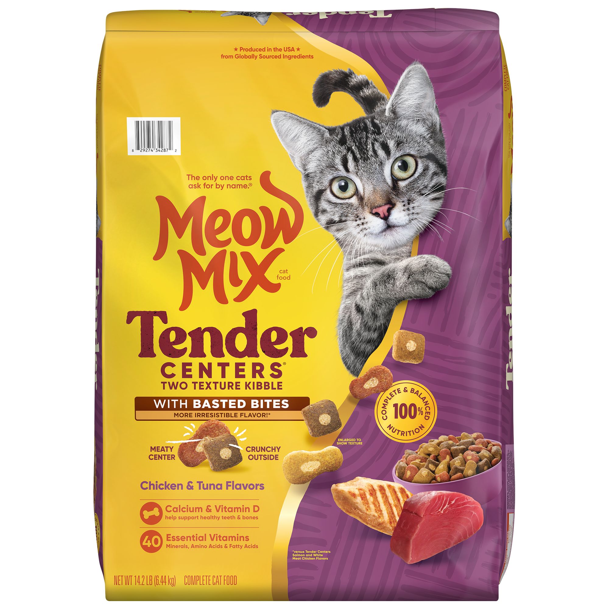 Features & Benefits: Contains one (1) 14.2–pound bag of Meow Mix Tender Centers Dry Cat Food, now with a new look! Two texture kibble with a meaty center surrounded by a crunchy outer layer. Made with the delicious flavors of salmon and white meat chicken. One hundred percentcomplete and balanced nutrition for adult cats Produced in the U.S.A. from globally sourced ingredients