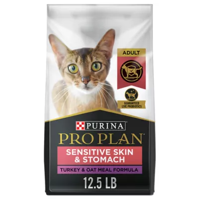Fill your cat's bowl with the targeted nutrition in Purina Pro Plan Brand Cat Food Sensitive Skin and Stomach Natural Turkey and Oat Meal Formula With Added Vitamins, Minerals and Nutrients adult dry cat food. This SPECIALIZED recipe supports a cat's healthy skin, shiny coat and digestive health. This formula is high in protein to meet your cat's unique nutritional needs and features real turkey as the first ingredient. Rice and oat meal are included in this highly digestible formula, which is gentle on your cat's stomach. In addition, guaranteed live probiotics support her overall digestive and immune health, giving her a meal to help her thrive. Finally, this sensitive skin and stomach cat food is formulated without corn, wheat or soy and does not contain any artificial colors, flavors or preservatives, giving you added peace of mind. Help your cat live her best life when you feed her this natural formula with added vitamins, minerals and nutrients, which is designed especially for cats with sensitive skin and stomachs.