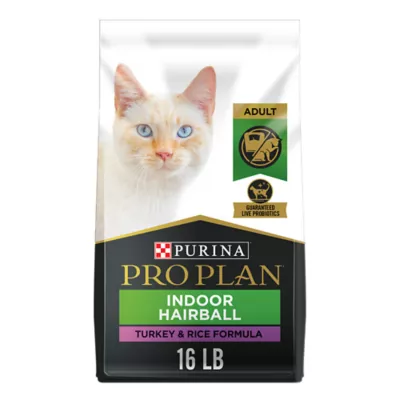 Pay extra attention to your indoor cat's special nutritional needs and help control hairballs when you feed her Purina Pro Plan Indoor Hairball Turkey & Rice Formula adult dry cat food. This formula features high-protein nutrition to help her maintain a healthy weight, and it contains high-quality protein sources, including real turkey as the first ingredient. Natural prebiotic fiber nourishes specific intestinal bacteria for digestive health. Every ingredient in this dry cat food is carefully chosen for a specific purpose, so you can feel confident about the food you put in your cat's dish every day. This dry cat food delivers essential nutrients, including antioxidants to help support her healthy immune system, and it provides 100% complete and balanced nutrition for adult cats. Nurture your cat's natural greatness when you make this formula part of her daily diet.