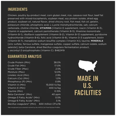 Chicken, Poultry By-Product Meal, Corn Gluten Meal, Brewers Rice, Cassava Root Flour, Animal Fat Preserved with Mixed-Tocopherols, Soybean Meal, Soy Protein Isolate, Dried Egg Product, Soybean Oil, Animal Liver Flavor, Dried Chicory Root, Fish Meal, Fish Oil, Potassium Chloride, Gelatin, Phosphoric Acid, L-Lysine Monohydrochloride, Salt, Calcium Carbonate, Vitamin E Supplement, Choline Chloride, Taurine, Beta-Carotene, Zinc Sulfate, Ferrous Sulfate, Niacin, L-Ascorbyl-2-Polyphosphate (Vitamin C), Manganese Sulfate, Vitamin A Supplement, Calcium Pantothenate, Thiamine Mononitrate, Riboflavin Supplement, Copper Sulfate, Vitamin B-12 Supplement, Pyridoxine Hydrochloride, Folic Acid, Vitamin D-3 Supplement, Biotin, Calcium Iodate, Menadione Sodium Bisulfite Complex (Vitamin K), Sodium Selenite. A-4624