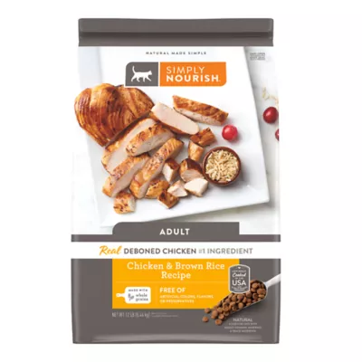 Make ]Simply Nourish Chicken & Brown Rice Recipe Adult Dry Cat Food includes a blend of superfoods like flaxseed and cranberries and other naturally nutritious ingredients.