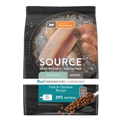 Simply Nourish Source Fish & Chicken Recipe Indoor Adult Cat Food contains optimal calories from protein and fat to help maintain a healthy weight and ideal body condition. Feed your cat's well-being and support overall health with this delicious dry blend.