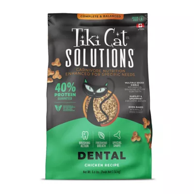 Features & Benefits: Complete & Balanced Reviewed & Recommended by Tiki Cat® Veterinary Nutritionists40% Protein Guaranteed Parsley & Spearmint Freshens Breath Multiple Edged Kibble Mechanical Brushing Action for Teeth Oven–Baked, Minimally Processed Brushing Action