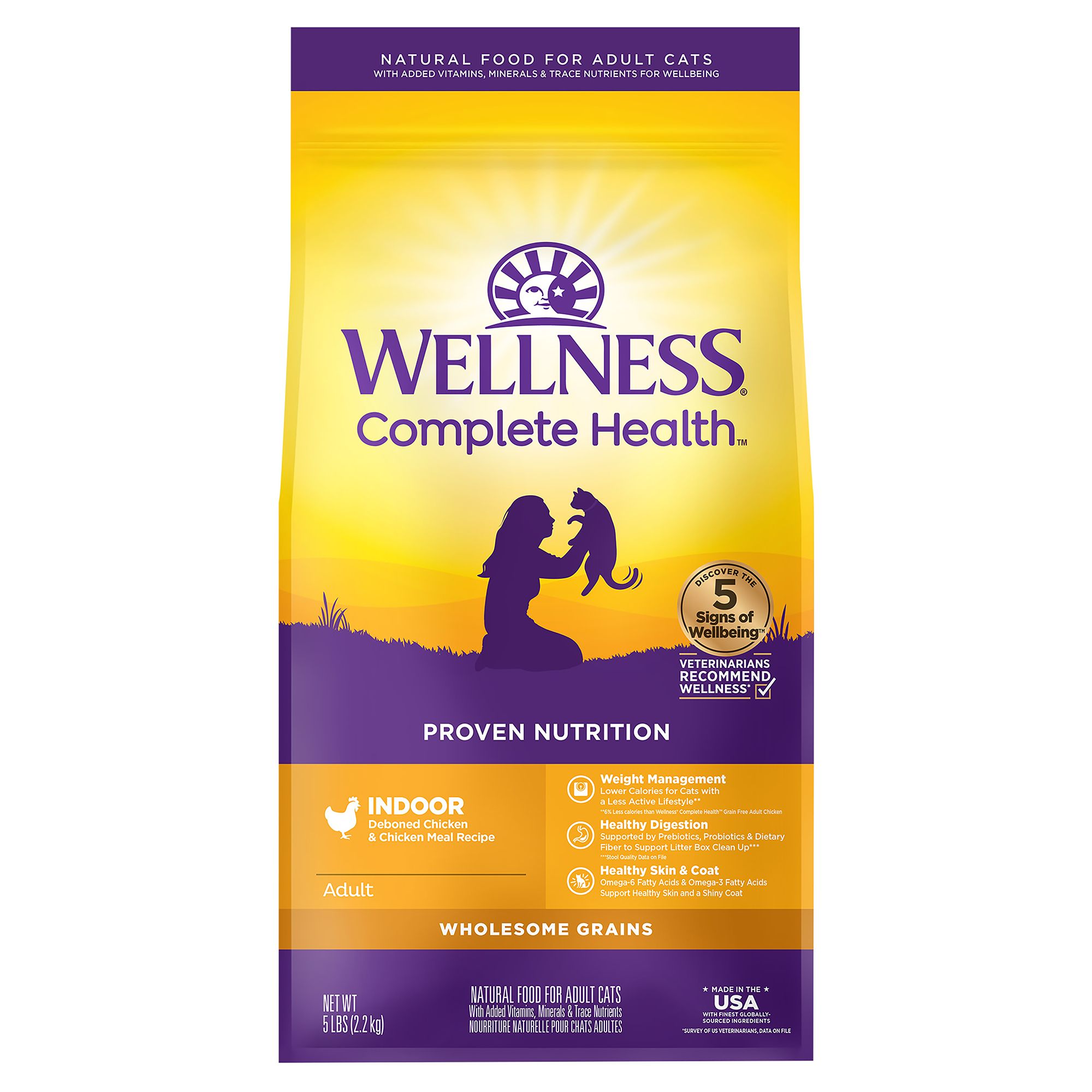 ENJOY A LIFETIME OF WELL-BEING TOGETHER: Working with our staff of vets, nutritionists and scientists, we create each diet to deliver everything your cat needs to thrive, for a lifetime SPECIALLY MADE FOR ADULT CATS: This adult dry grained recipe features the right balance of protein and fat with real chicken as the first ingredient; formulated with a balanced blend of Omega Fatty Acids, vitamins and minerals WHOLE BODY HEALTH: Crafted to support your cat's total wellbeing including plenty of energy for playtime, a lustrous skin and coat, sound digestion and immunity, strong teeth and healthy eyes, plus controlled minerals for urinary health supportCATISFACTION PROMISE: 9 out of 10 cats agree, Wellness offers a full range of wet and dry cat food to support your cat's specific taste preferences and needs with dozens of flavors, textures and solutions MADE IN THE USA: using only the finest globally sourced ingredients, we prepare each of our diets in our own state of the art facility; we craft delicious natural recipes with wholesome, non GMO ingredients chosen for their nutritional benefits