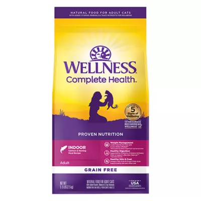 DESCRIPTION Wellness Complete Health Grain Free Indoor Health Recipe features the right balance of protein & fat that cats crave. Healthy fiber and L-Carnitine help to support cats with a less active lifestyle. This delicious recipe is formulated with a balanced blend of Omega Fatty Acids, vitamins