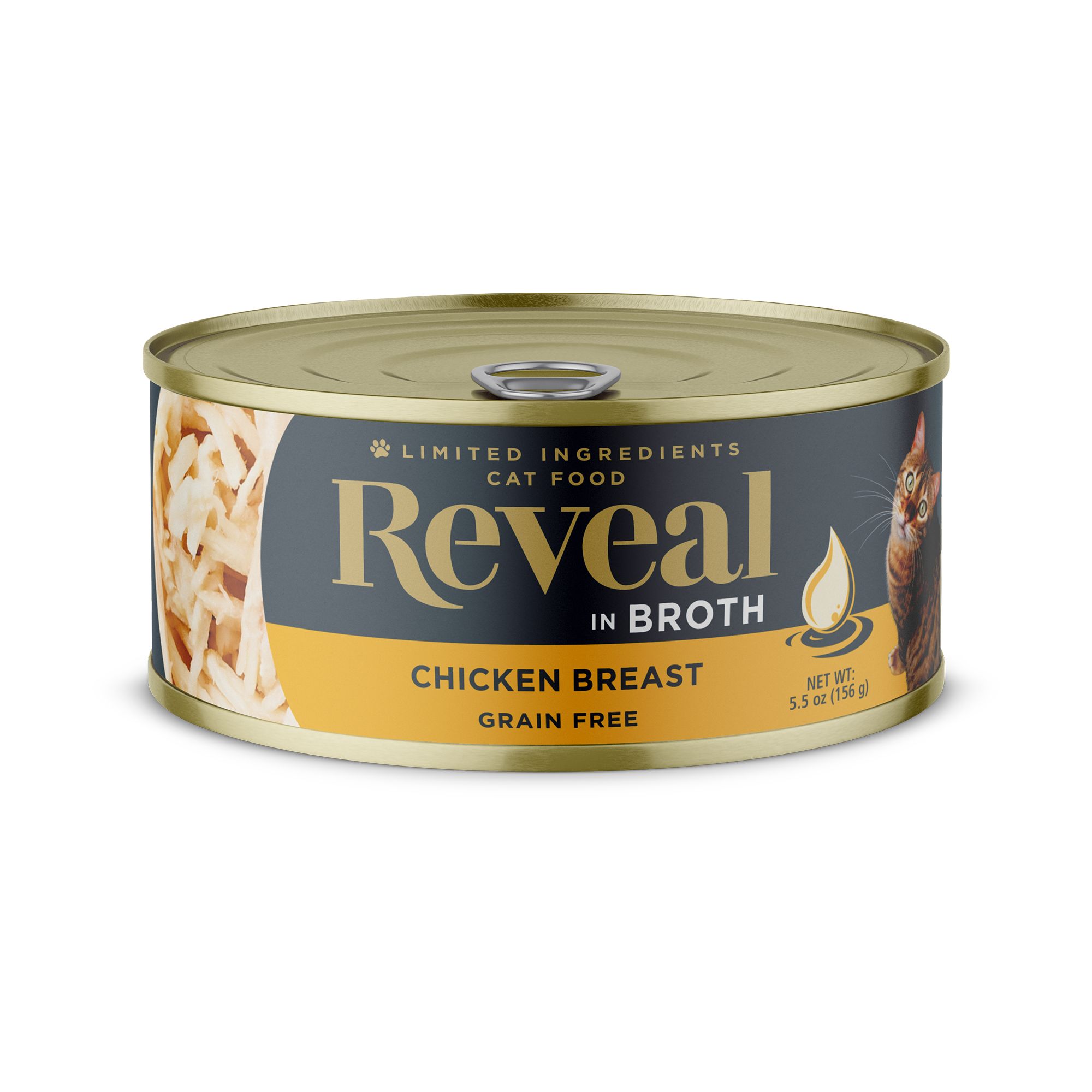 DESCRIPTION Cats can't wait to get into a can of Reveal. Every recipe is made with truly limited ingredients and is totally grain free. With our tasty toppings, your cat will race to you as soon as the can clicks!