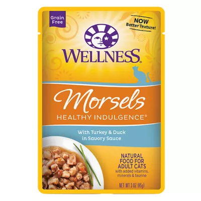 Few cat foods blend proper nutrition and delicious flavor quite like Wellness Healthy Indulgence Natural Grain Free Morsels with Turkey and Duck in Savory Sauce. Your cat will come to crave this flavorful feast, and all the while she will benefit from an ingredient list that includes high quality proteins, flaxseed, Omega 3 fatty acids, cranberries, blueberries and more.