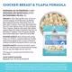 Chicken Breast and Tilapia for increased palability. Contains lower levels of