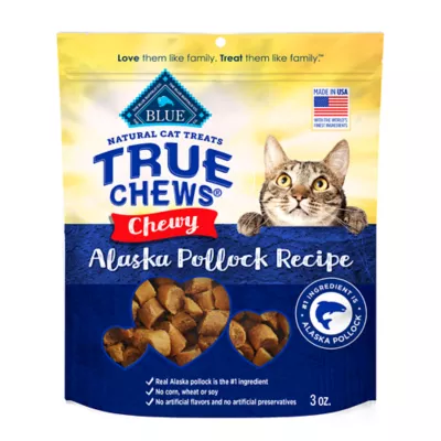 DESCRIPTION Give your cat a meaty reward worth remembering with BLUE True Chews Chewy Cat Treats. Made with real Alaska pollock first, these delectable, bite-sized morsels feature high-quality, healthy ingredients you can feel great about feeding your cat. They are a natural cat treat guaranteed to get purrs of approval from the pickiest cat companions. BLUE True Chews are brought to you by Blue Buffalo, the leader in natural pet food. Love them like family. Treat them like family.