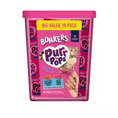 Description: Treat your cat to a mixed tub of BONKERS Purrpops lollipop cat treats in Tip–Top Tuna & Lip Smackin' Salmon flavor, the newest way to connect with your cat. Cats can't speak human. But if they could, BONKERS Purrpops cat treats would leave them speechless. Not just because it's hard to talk cat with a Purrpop in your mouth. But because it's shockingly good. A meaty, chewy, crunchy, bitey cat–candy. 100% freeze–dried, served on a stick. No words, just purrs. Standard Purrpops reaction.– Value pack tub includes 18 x high protein cat treat lollipops– 100% freeze dried treats– Free from artificial colors, flavors or nasties – Create a BONKERS bonding moment with your cat, the perfect gift!– Carefully formulated by animal nutritionists– Suitable for all cat life stages