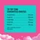 Guaranteed Analysis: Tuna: Crude Protein 60% min, Crude Fat 20% min, Crude Fiber 1% max, Crude Ash 10% max, Moisture 6% max. Salmon: Crude Protein 65% min, Crude Fat 15% min, Crude Fiber 1% max, Crude Ash 10% max, Moisture 6% max.