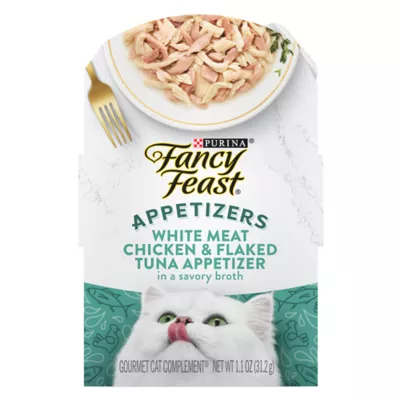 Make mealtime a delight for your cat with a Purina Fancy Feast Appetizers White Meat Chicken and Flaked Tuna Appetizer lickable adult cat food topper. The handcrafted tender grain free bites are made with real chicken and real tuna cat food, while a delicate Fancy Feast broth for cats adds the perfect finishing touch to this gourmet mix-in. Each cat food complement tray holds the perfect serving size for a scrumptious between-meal snack. Serve your sophisticated feline a Fancy Feast flaked wet cat food lickable snack as a tasty and moist topper on her dry cat food for a quick way to turn her usual cuisine into an extraordinary feast for the senses. Our grain free cat food toppers her the exceptional taste and texture she counts on from Fancy Feast in a carefully crafted recipe with no artificial colors, flavors or preservatives. This limited ingredient wet cat food mixer with added vitamin B1 also contains no meat byproducts or fillers for a quality blend of goodness in her dish.
