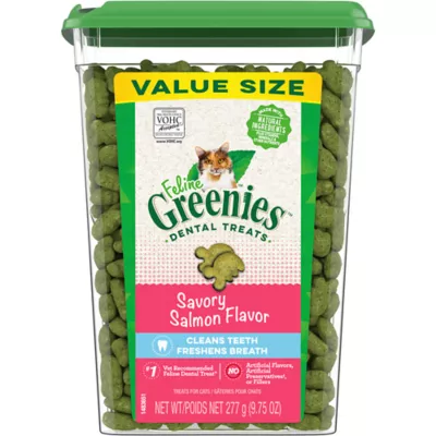 Perfect Cat Treats For Daily Dental Care: Feline Greenies Natural Dental Treats for Adult Cats are crafted to support the 4 areas veterinarians check most: plaque, tartar, gums, & breath; and are made with natural ingredients plus vitamins, minerals & nutrients.#1 Veterinarian–Recommended Treat for Cat Dental Care: Feline Greenies Dental Cat Treats are the #1 veterinarian–recommended cat dental treats that clean teeth and freshen breath.Crunchy Cat Dental Treat Texture Fights Tartar: Including Greenies dental treats for cats into your daily dental care routine supports 36% less tartar accumulation in 28 days (Data on file).Clinically Proven Oral Care: This cat dental treat offers clinically proven oral care to help maintain your cat's dental hygiene.Unique Texture For Cat Dental Care: These Greenies cat treats for teeth cleaning have a unique design that cleans down to the gumline with a taste your cats will love.Tasty Cat Treats: You'll surely hear happy purrs of joy as your feline enjoys the delicious taste of a savory salmon–flavored cat dental treat.9.75 oz. Tub: Contains one (1) 9.75 oz. tub of Feline Greenies Adult Dental Cat Treats, Savory Salmon Flavor.Species: Cat