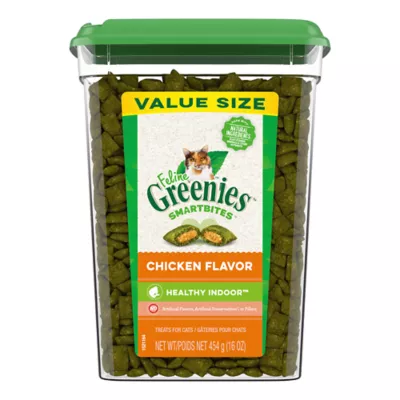 Bite–Sized Cat Treats: Feline Greenies Smartbites Healthy Indoor Cat Treats are bite–sized cat treats with a benefit. Cat Treats for Indoor Cats: Greenies Fiberblend formula in these cat treats helps support the health of indoor cats with natural fiber for healthy digestion.Healthy Cat Treats for Daily Treating: Less than 2 calories per treat, these tasty cat treats are nutritionally complete and balanced for adult cats and designed for daily treating. Dual–Textured Cat Snacks: Perfect for finicky felines, Greenies Smartbites are a dual–textured treat that's crunchy on the outside and soft on the inside with a taste your cat can't get enough of!Natural Cat Treats: Feline Greenies Smartbites Healthy Indoor Cat Treats are designed to support the health of indoor cats and are made with natural ingredients plus vitamins, minerals & nutrients.Quality Ingredients: Feline Greenies Smartbites Healthy Indoor Cat Treats contain high–quality protein and are made without artificial flavors or fillers.16 oz. Tub: Contains one (1) 16 oz. pack of Feline Greenies Smartbites Healthy Indoor Cat Treats, Chicken Flavor.Species: Cat