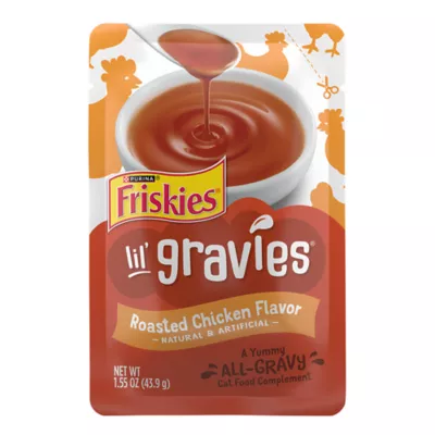 Description: Feed your cat's gravy fantasy with Friskies Lil' Gravies Roasted Chicken Flavor Cat Food Complement. Made with yummy roasted chicken flavor, each pouch of gravy—licious goodness