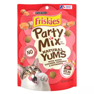 Key Benefits: Friskies cat treat made with real fish as the first ingredient and 2 calories per treat, Purina cat treat features a natural recipe cats love with added vitamins, minerals and nutrients, Dry cat treats with unique shapes to keep her interested and a crunchy texture to please her palate, Our crunchy cat treats designed for adult cats are made with no artificial colors, flavors or preservatives, Friskies Party Mix cat treats are perfect for snacking or rewarding and are crafted in Purina-owned, U.S. facilities, Spoil your pet with Purina products. Reward yourself with points on every purchase. Download the myPurina app today.