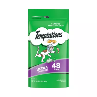48 oz. Pouch: Contains one (1) 48 oz. pouch of Temptations Classic Cat Treats Seafood Medley Flavor."