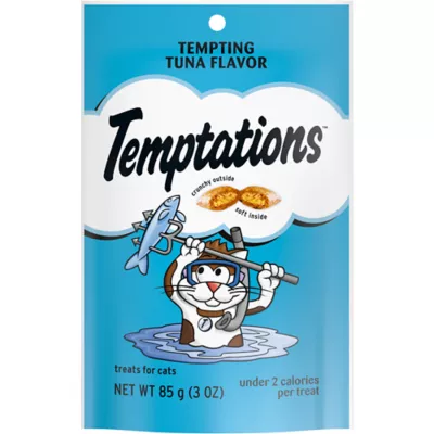 Cats love the delicious, crunchy taste of Temptations, so give your cat purr-worthy Temptations Classic Crunchy and Soft Cat Treats Tempting Tuna Flavor, and they'll come running the moment you open the pack. Each of these tuna-flavored cat treats has less than 2 calories and provides an irresistible combination of both crunchy and soft textures. They also come in a stay-fresh pouch, so your feline friend can enjoy their favorite cat snack when you open it, but not when they shouldn't! These Temptations Classic Cat Treats are a perfect addition to your cat's regular feeding routine: Use them as a treat, a meal, or a cat food topper. Temptations Classic Cat Treats are the purr-fect way to show your feline friend how much you care.