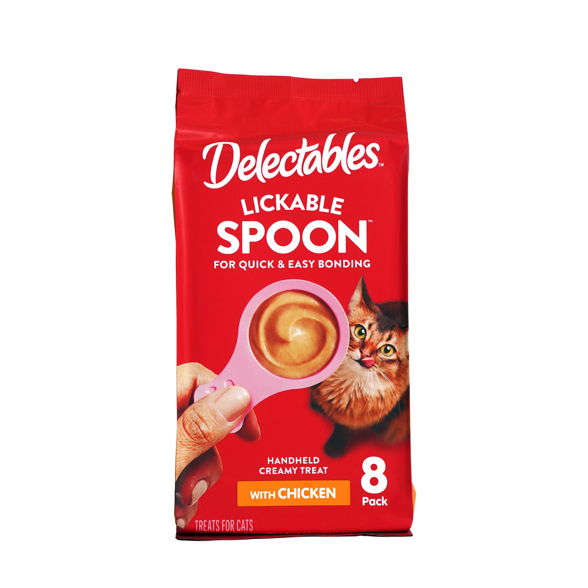 Your feline's favorite cat treat brand can be enjoyed in a Lickable Spoon format! Stir up some delicious moments with your furry best friend with Temptations Lickable Spoons Tasty Chicken and Cheesy Cheese flavor lickable wet cat treat. The creamy treat comes in a specially designed spoon and combines two tasty flavors. The purr-fect spoon size makes it easy to eat and easy to treat your cat for a memorable bonding experience. Temptations Lickable Spoons can also be used as a meal complement to make mealtime extra special. Temptations Spoons, with added vitamins and minerals, have no fillers or artificial flavors. Enjoy treat time with your furry feline, one spoon at a time!