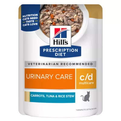 Features & Benefits: . Hill's Prescription Diet c⁄d Multicare Urinary Care Carrots, Tuna & Rice Stew Pouch Cat Food, is specially formulated by Hill's nutritionists and veterinarians to support a cat's urinary health. Clinically tested to lower the recurrence rate of most common urinary signs by 89%. Dissolves struvite stones in as little as 7 days (Average 27 days) and promotes desirable urine pH levels. Formulated to promote a urinary environment that reduces the risk of developing struvite and calcium oxalate crystals. Recommended for lifelong feeding of adult cats. Hill's Prescription Diet is the #1 US Vet Recommended therapeutic pet food – consult with your vet to make sure Prescription Diet c⁄d Multicare is the right food for your cat.