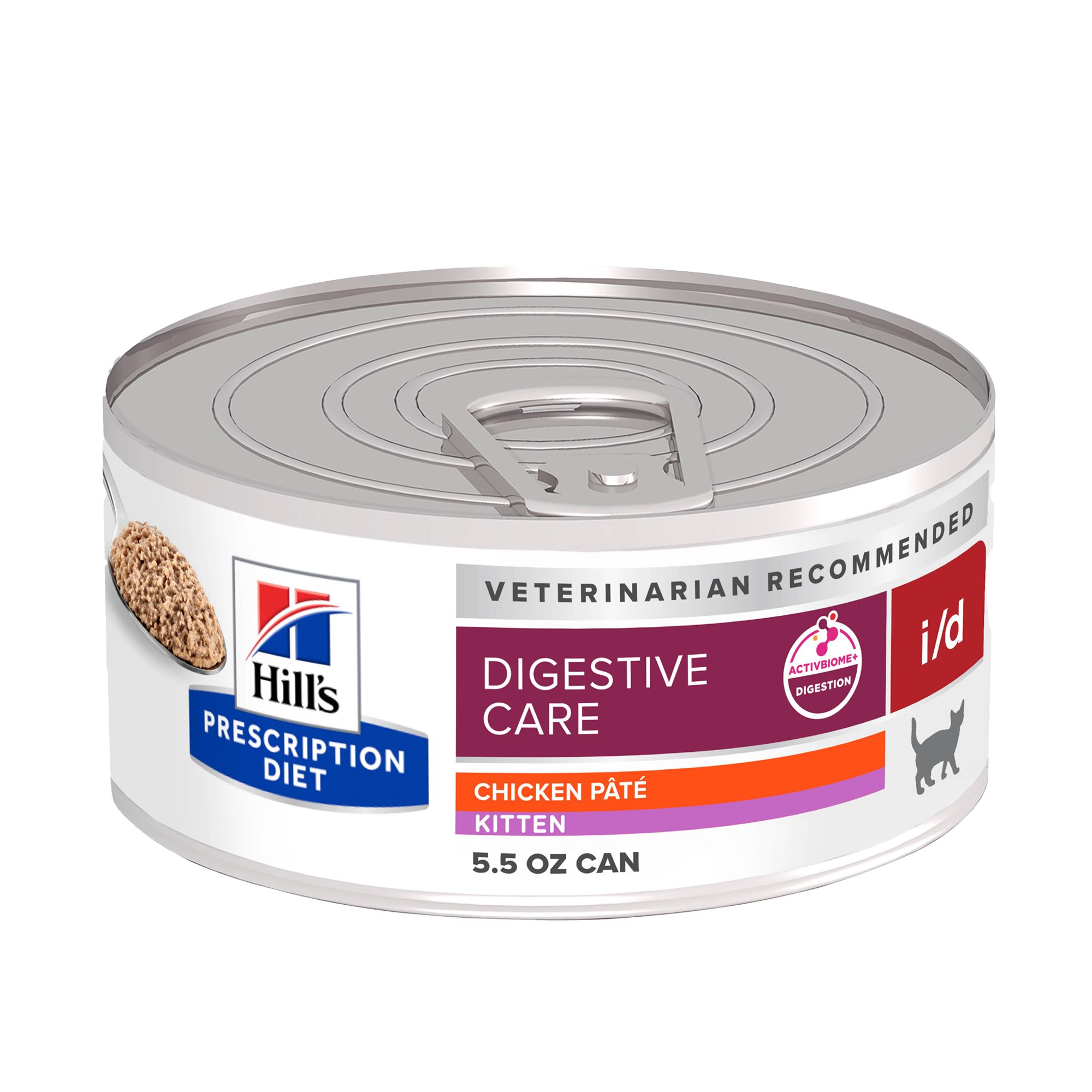 Features & Benefits: . Hill's Prescription Diet i/d Digestive Care with Chicken Canned Cat Food is specially formulated by Hill's nutritionists and veterinarians to support your cat's digestive health. Clinically shown to help settle digestive upsets in cats and improve stool quality. Highly digestible formula to support easy nutrient absorption. Soluble and insoluble fibers (including prebiotic fiber) to promote regular bowel movements and help balance digestive function. High levels of electrolytes & B vitamins help replace nutrients lost from digestive upset. Clinically proven antioxidants support a healthy immune system. Omega 3 & 6 fatty acids support healthy skin and luxurious coat. Hill's Prescription Diet is the #1 US Vet Recommended therapeutic pet food – consult with your vet to make sure Prescription Diet i⁄d is the right food for your cat.