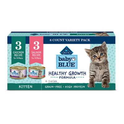 HEALTHY, WHOLESOME INGREDIENTS: This natural canned food for cats contains no chicken (or poultry) by–product meals and is free from corn, wheat, and soy Contains: Three (3) 3–oz cans of Baby BLUE Natural Kitten Wet Cat Food Chicken Recipe, and three (3) 3–oz cans of Baby BLUE Natural Kitten Wet Cat Food Salmon Recipe (6 cans total)