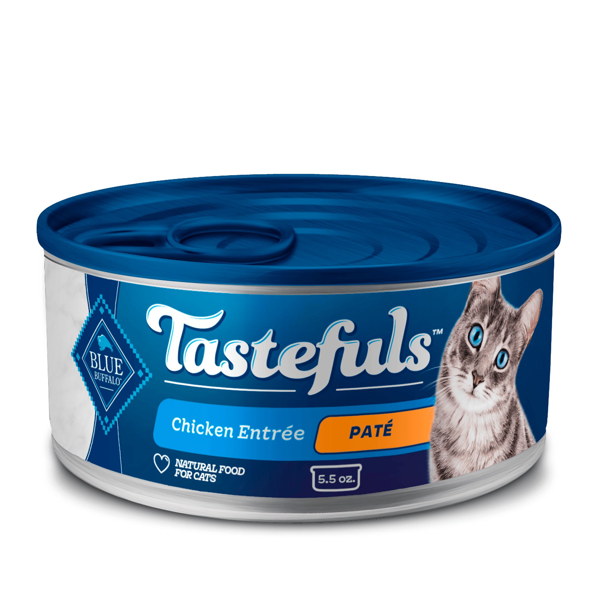 DESCRIPTION BLUE Tastefuls Spoonless Singles wet cat food starts with real chicken as the first ingredient in a delicious, silky-smooth pate with wholesome brown rice and sweet potatoes. This cat food from Blue Buffalo gives you a portion thatâs just right for one meal, so no more storing open cat food in the fridge. And our easy-to-serve twin-pack cups with a built-in chopper make feeding a breeze - no utensils are necessary! So snap it, peel it, pop it and chop it.