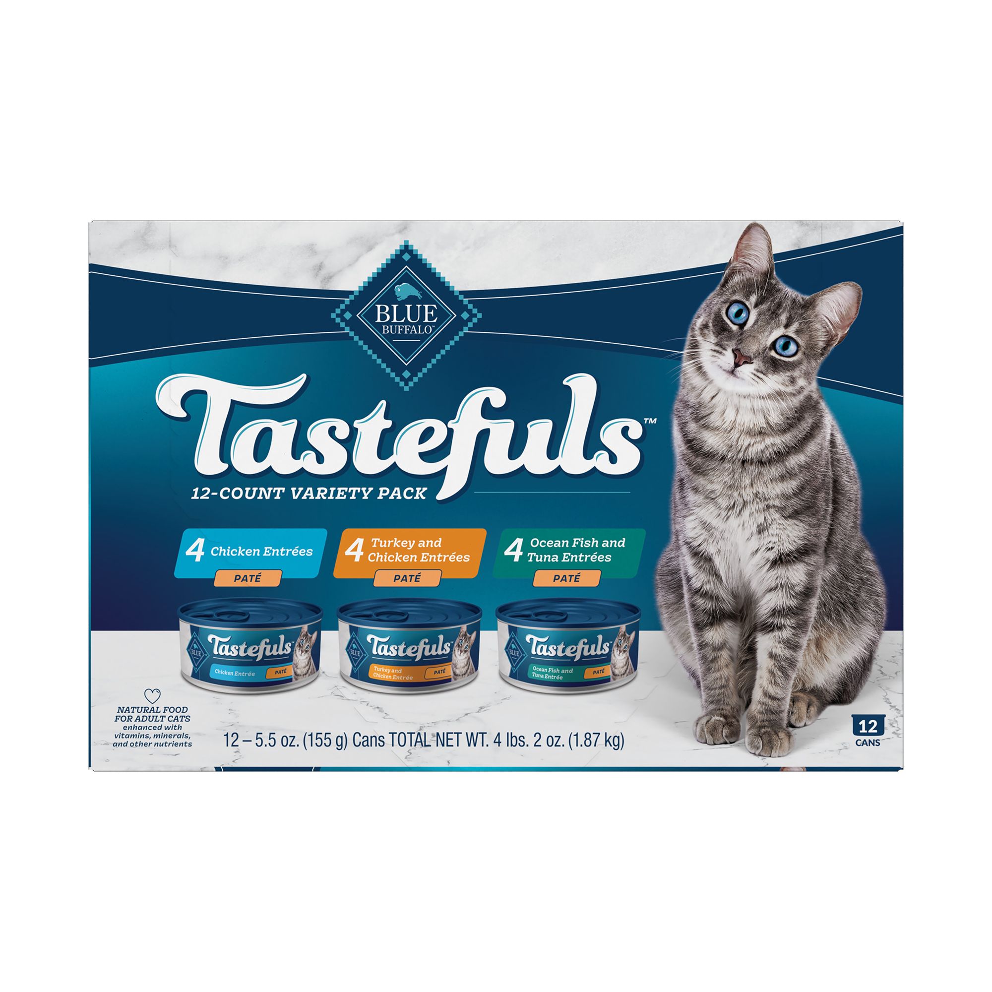 This BLUE Tastefuls canned food variety pack gives your cat a tasty trio of silky-smooth pates starting with high-quality chicken, salmon or whitefish as the first ingredient, plus brown rice and sweet potatoes. Made from the finest natural ingredients plus vitamins, minerals and other nutrients, our canned cat food has the great taste cats want with the healthy ingredients you prefer feeding. One taste of our mouthwatering wet cat food is all it takes for your cat to come back for more!