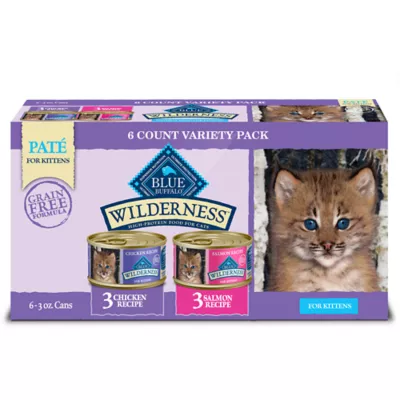 HEALTHY, WHOLESOME INGREDIENTS: This wet kitten food grain–free formula is made with no chicken (or poultry) by–product meals and no corn, wheat, or soy. Contains: Six (6) 3–oz cans of BLUE Wilderness High–Protein Grain–Free Wet Kitten Food Variety Pack, Chicken & Salmon Recipe