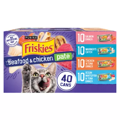 Features & Benefits: Made with seafood and chicken with a smooth, pate cat food texture to tempt her to her dish. Multi–can with seafood or chicken cat food pate variety pack makes it easy to stock your pantry with an array of delicious tastes she can't resist. Provides 100 percent complete and balanced adult cat food nutrition, including essential vitamins and minerals in every serving and no artificial colors or preservatives. Friskies canned cat food pate variety pack checked for quality and safety to provide added peace of mind and formulated to meet or exceed industry standards for cat food. Friskies cat food packaged in recyclable pull–tab cat food cans and proudly manufactured in Purina–owned U.S. facilities. Spoil your pet with Purina products. Reward yourself with points on every purchase. Download the myPurina app today.