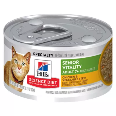 As your cats get older, their nutrition needs change. Hill's Science Diet Adult 7+ Senior Vitality Chicken & Vegetable Stew is specially formulated to help senior cats fight the effects of aging. This cat food made with natural ingredients uses a proprietary blend that supports your older cat's brain function, social interaction and overall vitality. The easy-to-digest formula is easy on a mature cat's stomach, while the omega-3s and omega-6s work to nourish your cat's skin and promote a healthy, shiny fur coat. There's more to love with the new look of Science Diet.