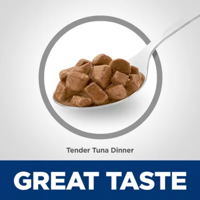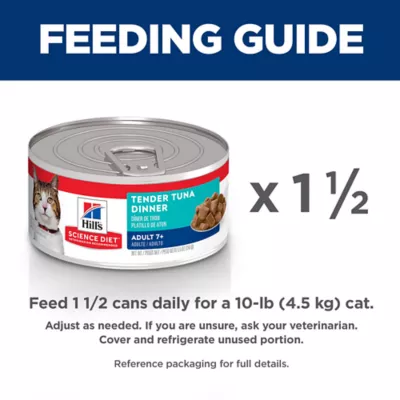 Packed with high-quality protein for maintaining lean muscle, Hill's Science Diet Adult 7+ Tender Tuna Dinner canned food uses the flavor of real tuna in a succulent wet food specially formulated for mature cats. This easy-to-digest senior cat food made with natural ingredients provides older felines with lean protein for muscle maintenance. Give your furry feline the perfect balance of taste and nutrition with this smooth canned food. There's more to love with the new look of Science Diet.