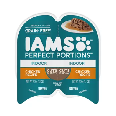 You want to keep your cat healthy at every stage of life that's why IAMS Perfect Portions Indoor Adult Wet Cat Food Cuts in Gravy Chicken Recipe was created for your indoor cat's health and well-being. These tasty indoor cat food recipes support your indoor feline's healthy immune system with antioxidant Vitamin E. Also, dietary fiber and prebiotic helps your cat maintain healthy digestion. This easy-to-chew, wet cat food comes in two individual meals and convenient, easy-peel trays. IAMS Perfect Portions Wet Cat Food is made in the USA with the finest ingredients from around the world and contains no artificial flavors or preservatives; although trace amounts may be present due to potential cross-contact during manufacturing. With IAMS Perfect Portions Indoor Adult Wet Cat Food, feel confident feeding your feline a cat food that helps keep them happy for life.