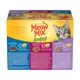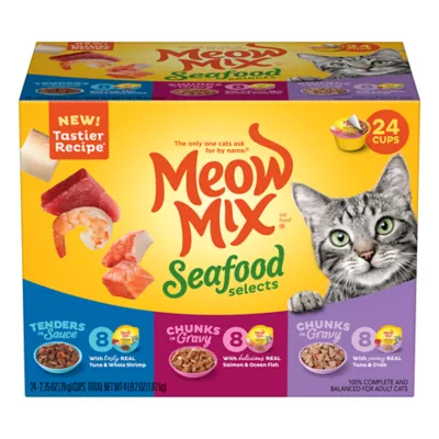 This wet cat food delivers the irresistible flavor your cats will adore! Discover their favorite flavor with Meow Mix wet cat food trays variety pack. With tender pieces of real fish in each variety, it's the meal little paws will come running for. This variety pack includes 24 cups in three delicious flavors, so you can be stocked up to treat your little guys and girls to the best with this juicy cat food. Tender Favorites features real tuna and whole shrimp in sauce, while Savory Morsels varieties are made with salmon or tuna and crab in gravy. These hearty flavors are sure to satisfy even the fussiest kitties! They also provide 100% complete balanced nutrition for adult cats as well as kittens. While we may never have them figured out, one thing we do know is that Meow Mix wet cat food is the gourmet-tasting meal cats ask for by name!