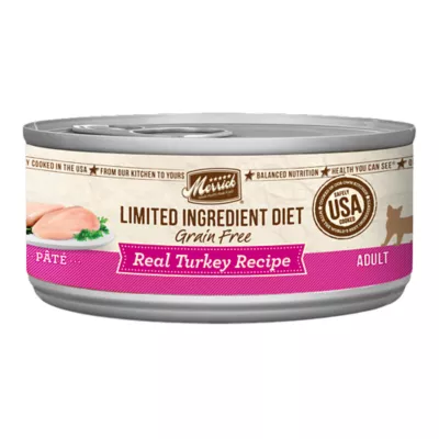 Features & Benefits: Merrick Limited Ingredient Diet Grain Free Turkey Recipe. Premium Gluten Free And Grain Free Natural Pate Canned Cat Food With Added Nutrients, Vitamins And Minerals. Real deboned turkey is the first ingredient in this wholesome canned wet cat food. This healthy, high protein canned cat food helps your cat maintain lean muscle mass. This premium limited ingredient cat food is made without grains, is potato free, and is natural with added vitamins, minerals and nutrients like taurine. Crafted to provide your cat with a holistic blend of nutrition, this grain free pate cat food with turkey is a moist and soft canned food that provides complete and balanced nutrition. Merrick limited ingredient cat food recipes are grain free andmade without artificial colors, flavors, or preservatives. Proudly founded in Hereford, TX, crafted in USA facilities
