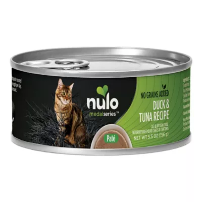 DESCRIPTION Please your favorite feline with this Nulo MedalSeries Grain-Free Duck & Tuna Recipe Canned Cat Food, which contains delectable, mouthwatering duck and tuna flavor in each bite. The food features a grain- and gluten-free formulation, plus contains a probiotic, to help cater to cats with digestive sensitivities. Only at PetSmart.