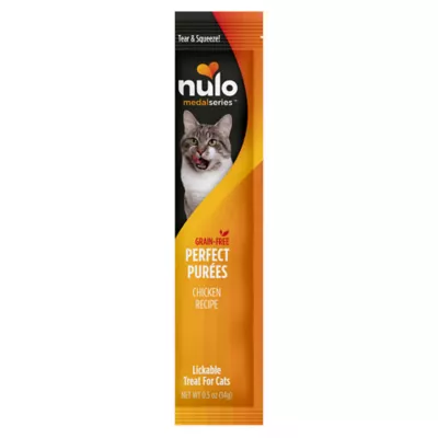 Nulo MedalSeries Puree is a highly nutritious cat treat made with meat and broth that's rich in flavor and low in calories Conveniently packaged, serve directly from the packet as a lickable treat or use as a topper on dry food. Premium cat treat with high moisture content to promote hydration. Includes Inulin for prebiotic fibers which contribute to a healthy digestive system. Broth is naturally rich in collagen protein. Made without grains, corn, wheat, soy, and artificial ingredients.