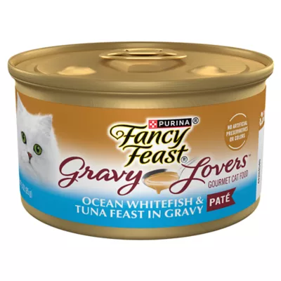 Delight your cat with an exceptional mealtime experience every time you open a can of Purina Fancy Feast Gravy Lovers Ocean Whitefish and Tuna Feast Pate in Gravy cat food. Crafted in partnership with our expert nutritionists, this protein-rich recipe features the irresistible taste of real ocean whitefish and tuna while delivering 100 percent complete and balanced nutrition for adult cats. This flavorful pate in gravy cat food includes a blend of vitamins and minerals for their whole-body health, an alluring pate cat food texture and an enticing Gravy Lovers cat food taste for an unforgettable mealtime experience. This canned cat food is made without artificial colors or preservatives, giving your cat everything they need and nothing they don't. Show your cat you love them with the spellbinding aroma and irresistible gourmet meal flavor in this high-quality cat food pate in gravy. Each can is thoughtfully crafted and tested for quality and safety in Purina-owned U.S. facilities.