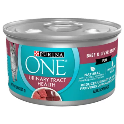 Delight your cat and support her overall health with Purina ONE Urinary Tract Health Beef and Liver Recipe wet cat food. This wet food for cats reduces your pet's urinary pH. Feeding this Urinary Tract Health formula throughout her adult years helps maintain a healthy urinary tract. Crafted with real beef and 0 percent fillers, this tasty recipe delivers the rich, meaty flavor that your pet craves. Each can combines natural, high-quality ingredients and added vitamins and minerals to help promote a healthy diet. Plus, it's made without artificial colors, flavors or preservatives, and we leave out potato, soy, wheat and corn to meet your ingredient criteria. The wholesome formula includes antioxidants to help promote immune health. With its natural flavors and carefully selected ingredients, this Purina ONE pate cat food creates a meal that's both delicious and beneficial for your cat's urinary tract health.