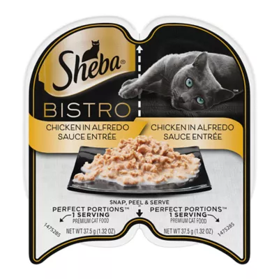 Contains one (1) 2.6 oz twin–pack trays (48 servings total) of Sheba Perfect Portions Bistro Adult Wet Cat Food, Chicken in Alfredo Sauce Entree.What Cats Want: Sheba Perfect Portions Bistro wet cat food is a nutrient–rich, premium, delicious meal made with added moisture to keep your cat hydrated.Perfect For Picky Eaters: Made with real meat, Sheba Perfect Portions Bistro Chicken in Alfredo Sauce Entree is a protein–rich meal with irresistible flavors in a variety of textures.A Fresh Meal With Every Peel: These easy–to–serve twin packs of wet cat food ensure two gourmet servings with zero messy leftovers at every meal â just snap, peel, and serve.Made With Essential Ingredients: Sheba Perfect Portions Bistro contains essential vitamins and minerals to help support your cat's overall health.Delicious Recipe: Sheba Perfect Portions Bistro wet cat food is formulated without grains, corn, or soy and contains no by–products or fillers, and no artificial flavors; although trace amounts may be present due to cross–contact during manufacturing.Quality Recipe: Made in the USA with the finest ingredients from around the world, Sheba Perfect Portions Bistro is complete and balanced for all life stages.Species: Cat