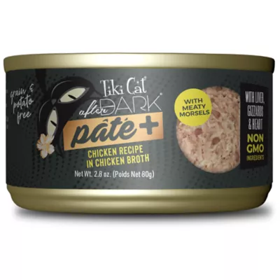 As obligate carnivores, cats have a natural instinct to hunt after dark and a nutritional need to eat meat. Tiki Cat After Dark Pate+ is a meat-lover's dream, closely mimicking cats' natural prey diets. Real, finely minced chicken and meaty morsels of organ meat are combined with savory broth for the soft texture cats love. Give your carnivore cat the meat they crave in this tasty, easy-to-eat meal!