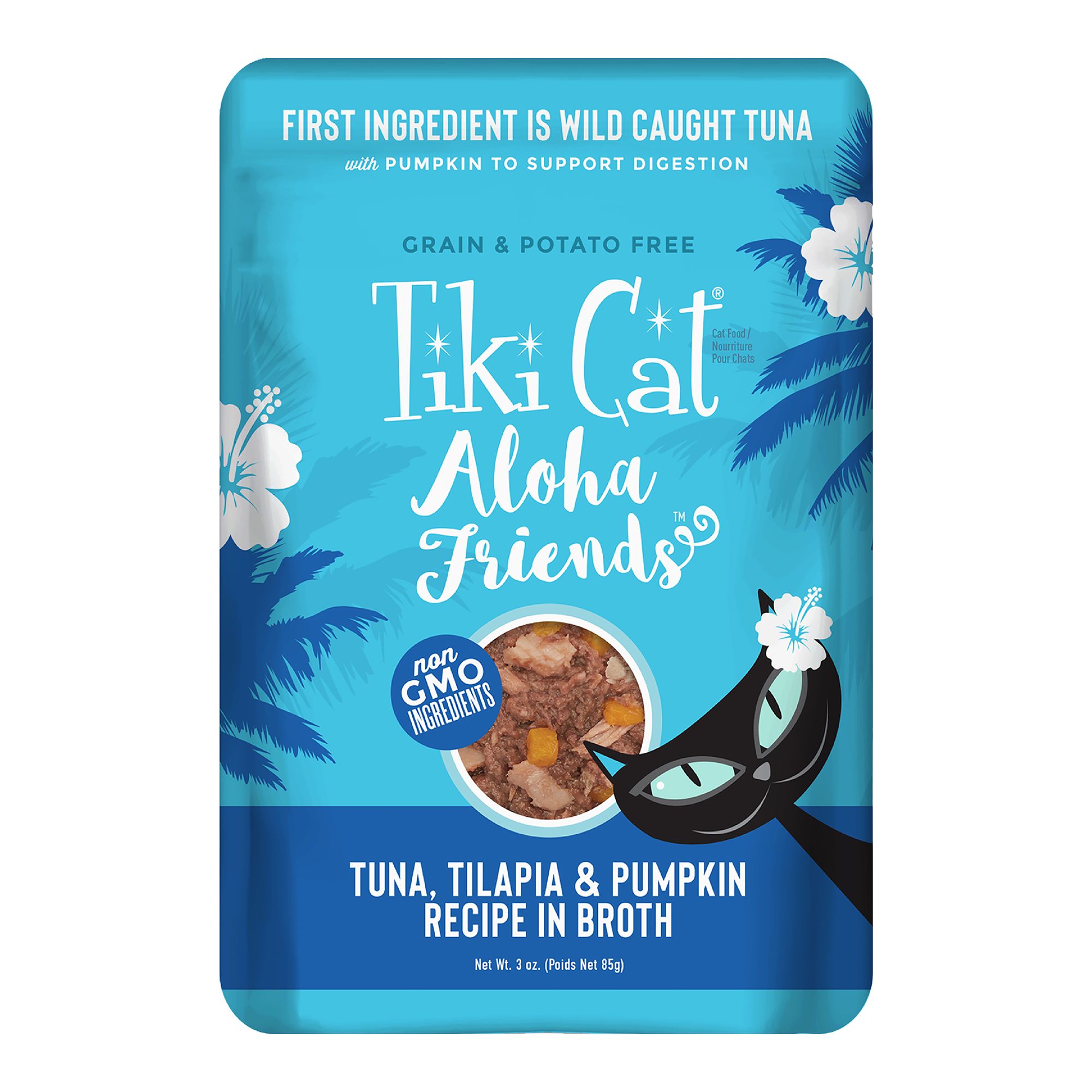 Tiki Cat Aloha Friends Tuna, Tilapia & Pumpkin Recipe in Broth is easy for cats to love and easy to digest! Tear open a pouch and you'll see why: real flaked tuna and tilapia and fiber-rich diced pumpkin are swimming in a tempting tuna broth. It's delicious, whole food, high protein nutrition cats want to befriend for life.