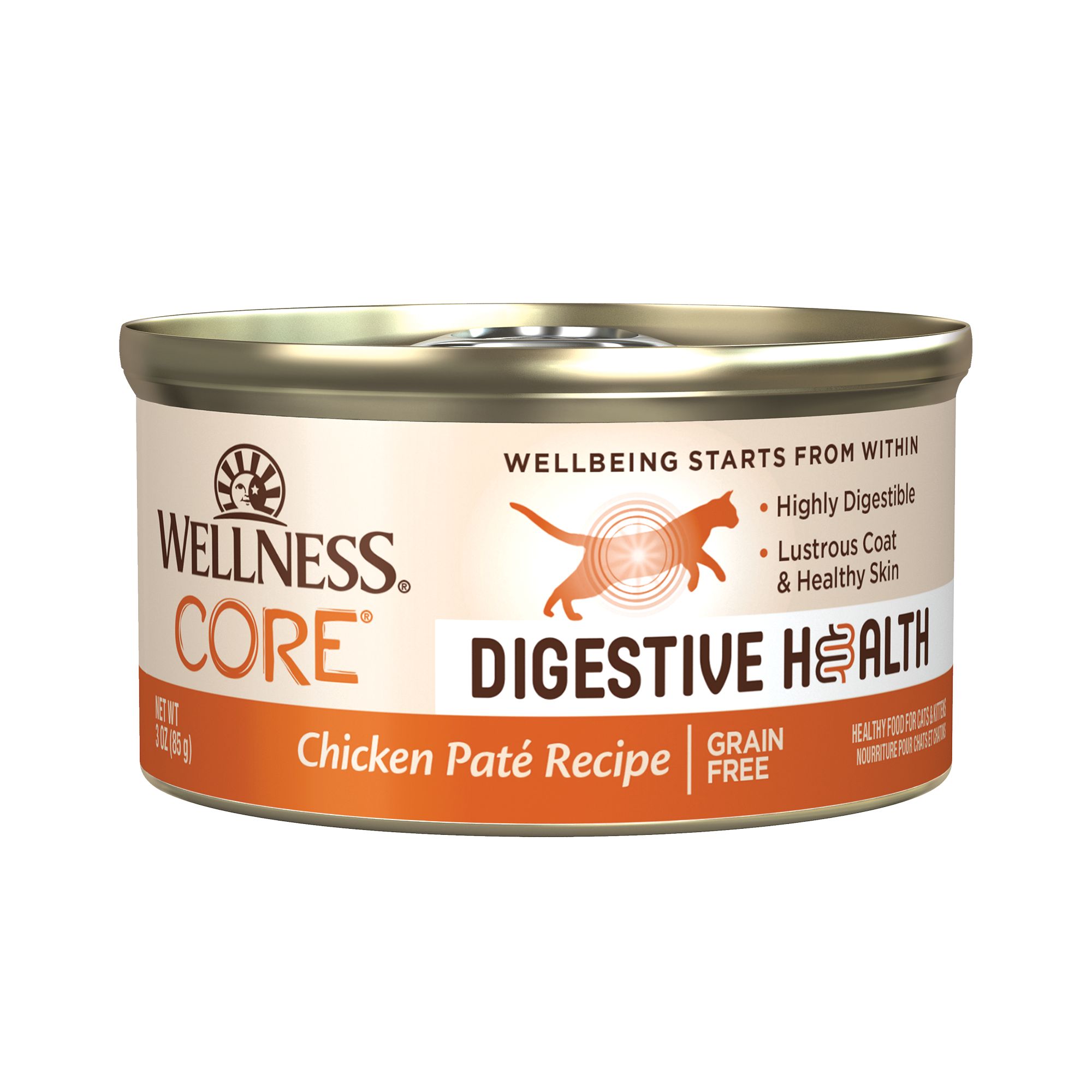 DESCRIPTION Did you know that your cat's well-being starts with a healthy gut? Wellness CORE Digestive Health is a highly digestible pate crafted with high-quality protein, prebiotic fiber, and superfoods such as pumpkin & papaya to support digestive health. Fuel your cat's best life, starting with digestive health. From their immune system to energy levels and even their skin and coat, it all starts with digestive health.