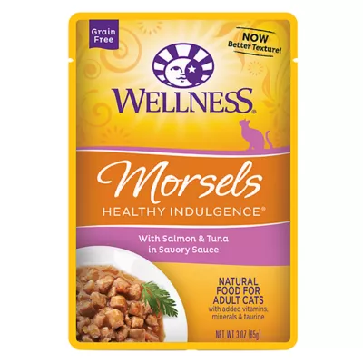 Wellness Healthy Indulgence Natural Grain Free Morsels with Salmon & Tuna in Savory Sauce features two incredible seafood flavors your cat will come to crave. More importantly, it is created with a list of essential ingredients that promote better health, and more specifically proper urinary tract health, hydration and healthier skin and coat.