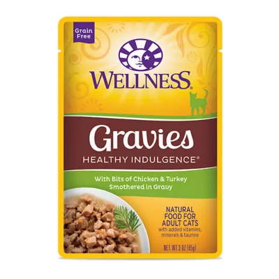 Wellness Healthy Indulgence Natural Grain Free Gravies with Chicken & Turkey in Light Sauce is a true indulgence when it comes to what your cat eats. Delicious flavor comes together with essential nutrients in a blend that features vitamins and minerals, high quality proteins, cranberries, blueberries and more. Serve a food that offers a great many benefits including proper urinary tract health, better hydration and healthier skin and coat.