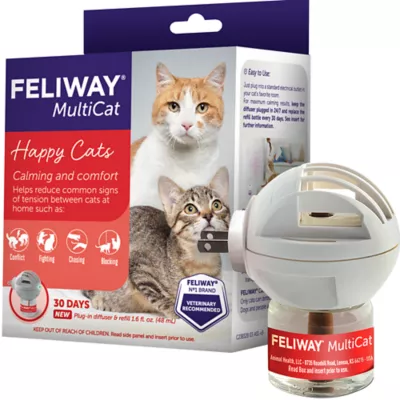 The Feliway Multi-Cat Starter Kit is clinically proven to reduce tension & conflict between household cats. This product creates a calming environment by mimicking natural feline pheromones. Drug and Odor free. #1 Vet recommended and used.