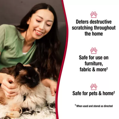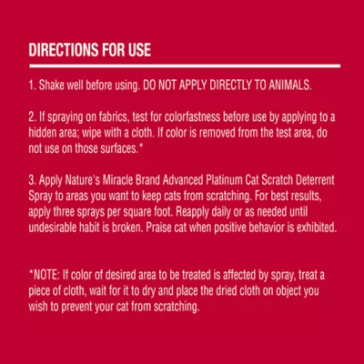 Scratching is an instinctual cat behavior. Nature's Miracle Brand Advanced Platinum Cat Scratch Deterrent Spray is specifically formulated to discourage destructive scratching throughout the home on household surfaces. Repellent scent deters cats from returning to the treated area. Design for indoor use; safe for use on furniture, fabric, and more when used as directed.