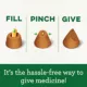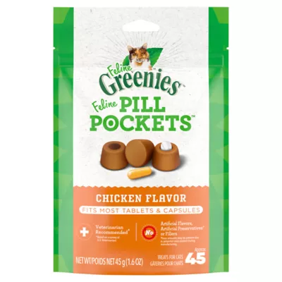 Take the stress out of giving your cat their medicine. FELINE GREENIES PILL POCKETS Treats for Cats easily hide most tablet-sized and capsule-sized pills in a great-tasting meaty treat thatâs made with natural ingredients plus minerals and trace nutrients. These soft cat treats are the #1 vet recommended choice for giving pills* and feature a delicious chicken flavor that helps disguise the taste of the medicine. It's the hassle-free way to give your cat medicine, just place their medicine inside the pocket, pinch the pocket closed to secure the pill or capsule, and share with your cat. Just like that, the treat (and medicine) disappears. When it comes to taking meds, your cat is smart. But you're smarter, because you've got FELINE GREENIES PILL POCKETS Cat Treats. * Based on a survey of U.S. veterinarians