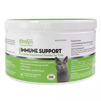 Just one scoop of Tomlyn L-Lysine Immune Support Powder contains 500 mg of lysine, which can help cats manage conditions responsive to lysine, including squinting, watery, red and/or itchy eyes, sneezing, runny nose and congestion. Lysine supports normal eye function, respiratory health, and a strong immune system. Plus, administration is easy - simply give one scoop of powder per day for as long as your cat needs immune system support. Whether your cat is fussy or will happily eat anything, our Tomlyn L-Lysine Immune Support Powder can be sprinkled over dry cat food or mixed with canned food.